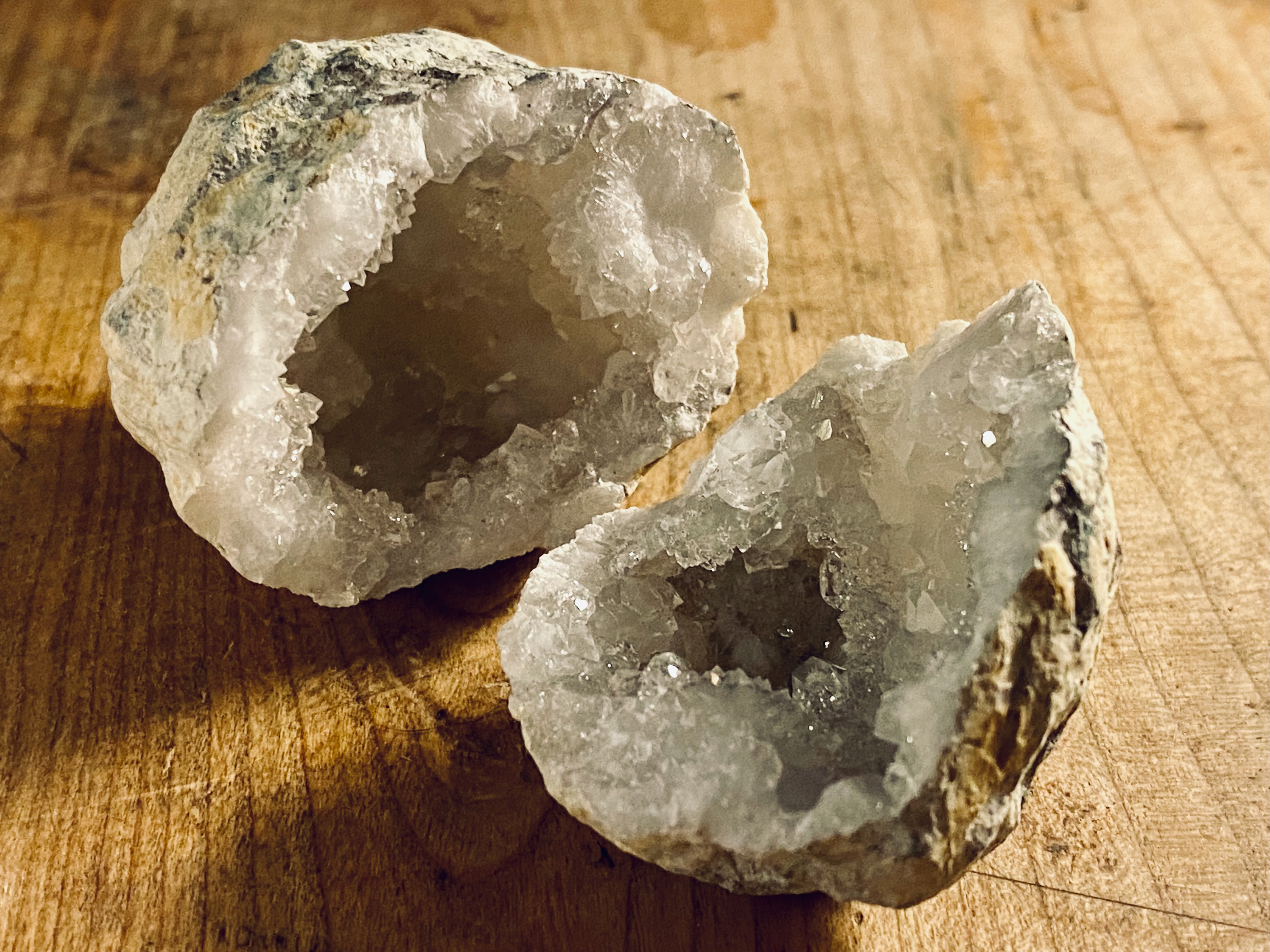 Du bekommst eine rund hunderttausend Jahre alte Druse zugeschickt. Das ist eine Kristallblase, die aus zwei Teilen besteht, da sie auseinandergebrochen ist. Sie ist rund sechs Zentimeter groß.